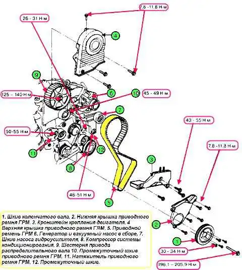 Bauen Sie den Nebenantriebsriemen wie folgt ein: Lichtmaschine ► Servolenkung ► Riemenscheibe ► Kompressor ► Kurbelwellenriemenscheibe ► Spannrolle.