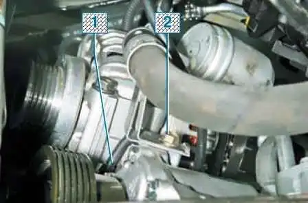 Trennen Sie bei einem Fahrzeug mit 1,6-Liter-Motor die Spitze des Kabels 1 vom Ausgang der elektromagnetischen Kupplung des Kompressors und schrauben Sie die Schraube 2 der Hochdruckschlauchhalterung um 10 heraus.