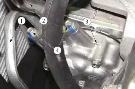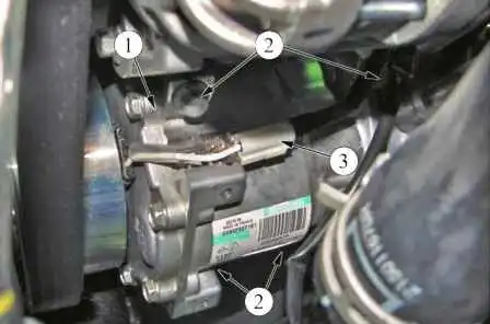Wir kombinieren die Löcher in den Ohren des Kompressors 1 und in der Halterung und installieren vier Schrauben 2 des Kompressors 1 in den Löchern. Das Anzugsmoment der Kompressorbefestigungsschrauben beträgt 21 Nm