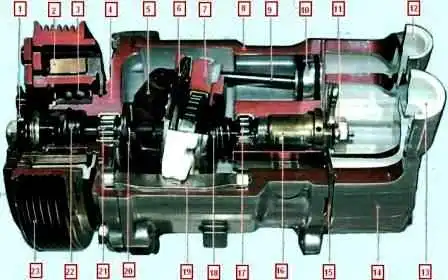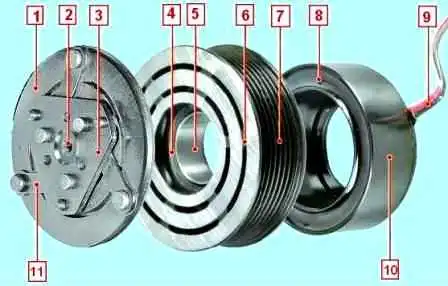 Beim Einschalten der Klimaanlage wird das Drehmoment über eine Reibungskupplung mit elektromagnetischem Antrieb von der Riemenscheibe auf die Kompressorwelle übertragen.