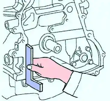 Benutzen Sie eine Ecke, um die Ölwanne am Zylinderblock an der Seite der vorderen Motorabdeckung auszurichten (Abb. 2)