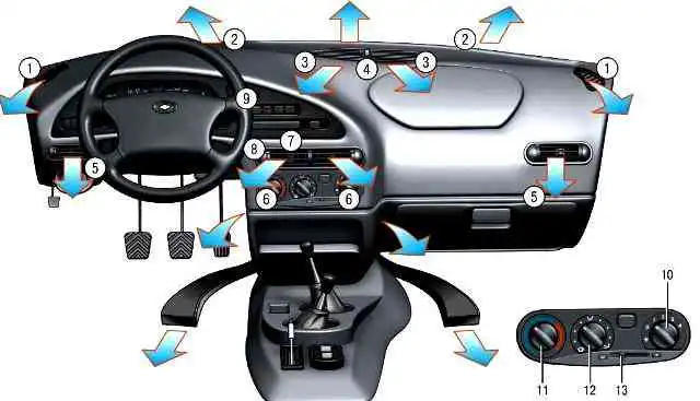 Bedienelemente zum Heizen und Belüften des Innenraums: 1 - Düsen zum Blasen der Fenster der Vordertüren; 2 - Luftkanal zum Blasen der Windschutzscheibe; 3 - obere Düsen; 4 - Regler für zusätzliche Luftzufuhr durch die oberen Düsen; 5 - Seitendüsen; 6 - zentrale Düsen; 7 - Hebel zum Einstellen der Luftstromrichtung; 8 - Griff des Luftstromintensitätsreglers; 9 - Schalter für elektrische Heizung der Heckklappenscheibe; 10 - Schalter für den Heizgebläsemodus; 11 - Zulufttemperaturregler; 12 - Luftstromverteilungsregler; 13 - Regler für die Außenluftzufuhr