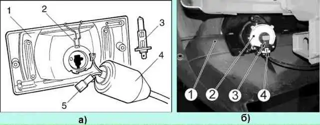 a) – bis zu 32 Konfigurationen (bis Februar 2009); GLS: 1 - Nebelscheinwerfergehäuse; 2 - Riegel; 3 - Lampe; 4 - Schutzhülle; 5 – Lampenblock