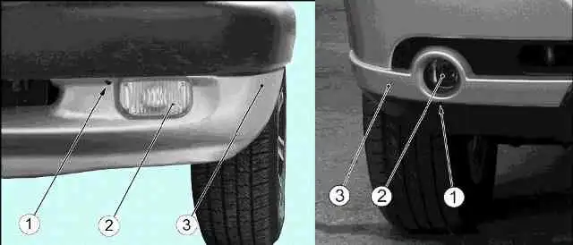 b) – bei einem Auto mit Konfiguration 55 (ab März 2009): 1 – vordere Stoßstange; 2 - Nebelscheinwerfer; 3 - Lampe; 4 – vorderer Kabelbaumblock