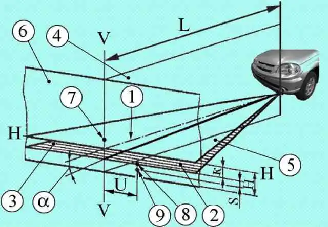 Stellen Sie ein vollgetanktes und ausgerüstetes Auto mit einer Last von 735 N (75 kgf) auf dem Fahrersitz auf eine flache horizontale Fläche 10 m vom Bildschirm entfernt (Abschirmung etwa 2 x 1 m groß usw.), sodass die Die Achse des Autos steht senkrecht zu ihm.