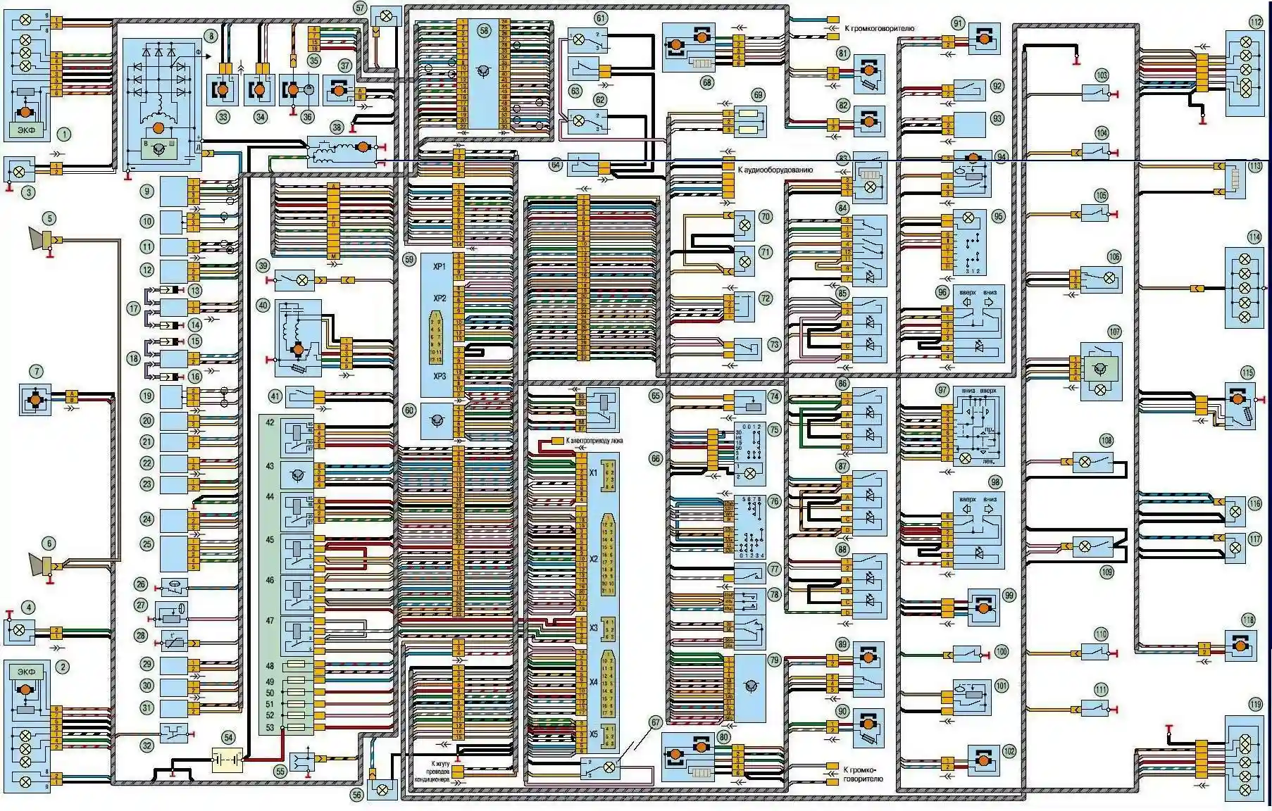 Электрооборудование автомобилей UAZ Patriot выпуска до 2007 г.: 1, 2 – блок-фары; 3, 4 – противотуманные фары; 5, 6 – звуковые сигналы; 7 – электровентилятор системы охлаждения двигателя; 8 – генератор; 9 – датчик концентрации кислорода; 10 – датчик положения распределительного вала (датчик фазы); 11 – датчик детонации; 12 – регулятор холостого хода; 13, 14, 15, 16 – свечи зажигания; 17, 18 – катушки зажигания; 19 – датчик положения коленчатого вала; 20, 21, 22, 23 – топливные форсунки; 24 – датчик положения дроссельной заслонки; 25 – датчик массового расхода воздуха; 26 – датчик сигнальной лампы аварийного падения давления масла; 27 – датчик указателя давления масла; 28, 30 – датчик температуры охлаждающей жидкости; 29 – датчик температуры воздуха; 31 – электромагнитный клапан адсорбера; 32 – датчик сигнальной лампы аварийного перегрева охлаждающей жидкости; 33, 34 – насосы омывателей ветрового стекла и стекла двери задка; 35 – колодка диагностики; 36 – электродвигатель водяного насоса; 37 – электродвигатель вентилятора отопителя; 38 – стартер; 39 – фонарь освещения подкапотного пространства; 40 – моторедуктор очистителя ветрового стекла; 41 – выключатель сигнальной лампы аварийного состояния тормозной системы; 42 – реле электровентилятора; 43 – реле включения омывателя стекла двери задка; 44 – реле стартера; 45 – реле системы управления двигателем; 46 – реле электробензонасоса; 47 – реле включения звуковых сигналов; 48, 49, 50, 51, 52, 53 – штыревые предохранители; 54 – аккумуляторная батарея; 55 – розетка для переносной лампы; 56 – левый боковой указатель поворота; 57 – правый боковой указатель поворота; 58 – контроллер системы управления двигателем; 59 – комбинация приборов; 60 – блок управления моторедукторами замков дверей; 61, 62 – плафоны освещения вещевых ящиков; 63, 64 – магнитные выключатели плафонов освещения вещевых ящиков; 65 – реле переключения режимов отопителя; 66 – монтажный блок, расположенный в салоне автомобиля; 67 – плафон подсветки монтажного блока; 68 – зеркало заднего вида правое; 69 – добавочный резистор электродвигателя вентилятора отопителя; 70, 71 – лампы подсветки блока управления отопителем; 72 – переключатель скорости работы электродвигателя вентилятора отопителя; 73 – выключатель стоп-сигналов; 74 – регулятор длительности паузы работы стеклоочистителя; 75 – выключатель (замок) зажигания; 76 – переключатель очистителя и омывателя ветрового стекла и стекла двери задка; 77 – выключатель звуковых сигналов; 78 – переключатель указателей поворота и света фар; 79 – модуль управления светотехникой; 80 – зеркало заднего вида левое; 81 – электростеклоподъемник правой передней двери; 82 – моторедуктор замка правой передней двери; 83 – прикуриватель; 84 – выключатель аварийной сигнализации; 85 – выключатель обогрева зеркал заднего вида; 86 – переключатель отопителя; 87 – переключатель режимов работы дополнительного отопителя; 88 – выключатель обогревателя стекла двери задка; 89 – моторедуктор замка левой передней двери; 90 – электростеклоподъемник левой передней двери; 91 – моторедуктор замка правой задней двери; 92 – выключатель света заднего хода; 93 – датчик скорости; 94 – электробензонасос с датчиком уровня топлива правого бака; 95 – переключатель датчиков указателя уровня топлива; 96 – переключатель стеклоподъемника правой передней двери; 97 – пульт управления наружн
