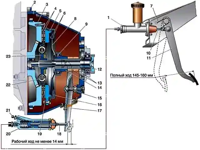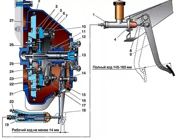 The clutch consists of an aluminum crankcase, a release clutch with a bearing and a fork, a drive disk assembly (basket), a driven disk, a main and a working cylinder connected by a hose and a tube.
