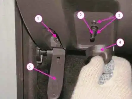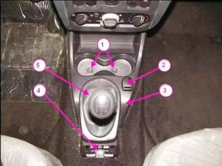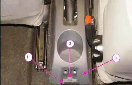 Having overcome the resistance of the clamps, we fold back the decorative plug 1, Figure 2, unscrew the screw 2 with the Torx T20 head and remove the rear part of the floor tunnel lining 3.