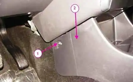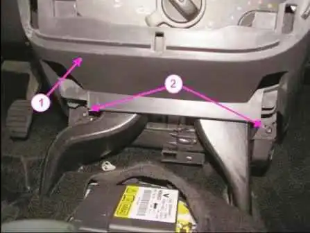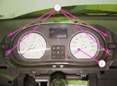 We unscrew one screw 1 from the right and left sides, Figure 12, of the upper fastening of the instrument panel 2.