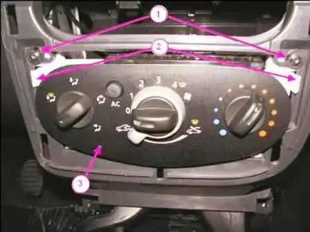 Using the Torx T20 head, unscrew the two screws 1, Figure 10, fastening the heating, air conditioning and ventilation control unit 3 to the instrument panel, squeeze the clamps 2 and push the unit inside the instrument panel.