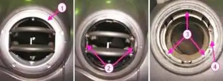 Remove the inner ring 2 of the ventilation nozzle and, having pressed the three latches 3, remove the housing 4 of the ventilation nozzle from the instrument panel.