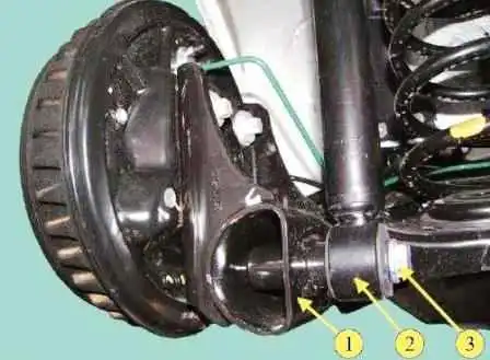 Place the shock absorber in the rear wheel arch, connect the shock absorber to the rear suspension arm and tighten, without tightening, a new mounting bolt (replaceable head 21, knob).