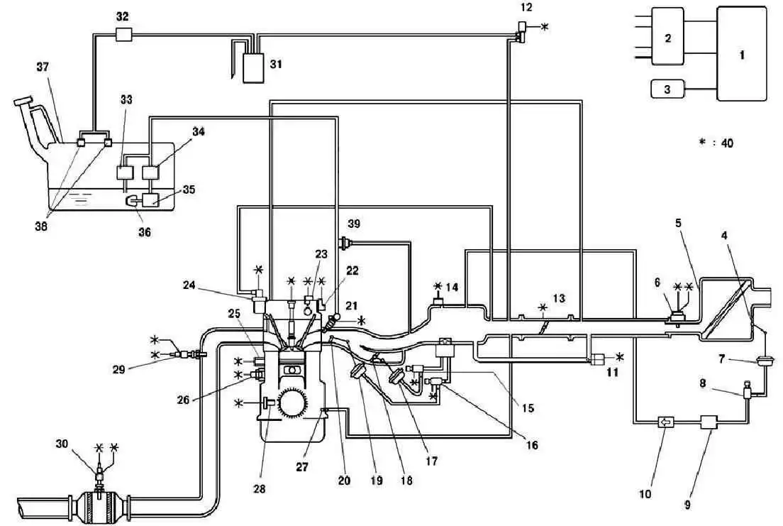 Fig.1 Scheme of the Mazda 3 fuel system management system: 1 - PCM block; 2 - ignition coil; 3 - generator; 4* – damper of the VAD system; 5 - air filter; 6 - mass air flow sensor; 7* – damper actuator of the VAD system; 8* - control solenoid valve of the VAD system; 9* – vacuum chamber; 10* - check valve of the VAD system; 11 - idle speed regulator; 12 – purge solenoid valve; 13 - throttle position sensor; 14 - absolute pressure sensor; 15* - control solenoid valve of the VIS system; 16 - control solenoid valve Variable tumble; 17* – damper actuator of the VIS system; 18* – damper of the VIS system; 19 - actuator damper system VTCS; 20 - damper of the VTCS system; 21 - fuel injector; 22* - control oil valve; 23 - camshaft position sensor; 24 - valve of the exhaust gas recirculation system; 25 - knock sensor; 26 - coolant temperature sensor; 27 - crankcase ventilation valve; 28 - crankshaft position sensor; 29 - heated oxygen concentration sensor (front); 30 - heated oxygen concentration sensor (rear); 31 - container with activated carbon (adsorber); 32 - check valve (double-sided); 33 - pressure regulator; 34 - fuel filter (high pressure); 35 - fuel pump; 36 - fuel filter (low pressure); 37 – fuel tank; 38 - gravity valve; 39 - pulsation damper; 40 - to the PCM block; Note – * : for L3 motors