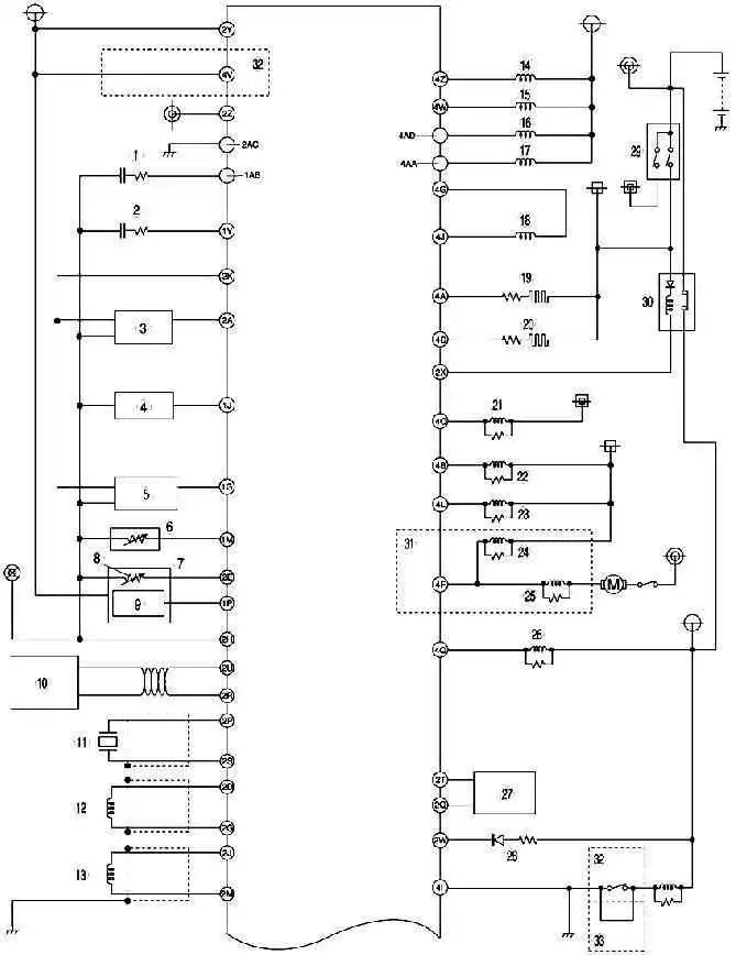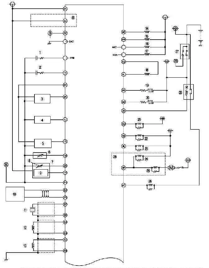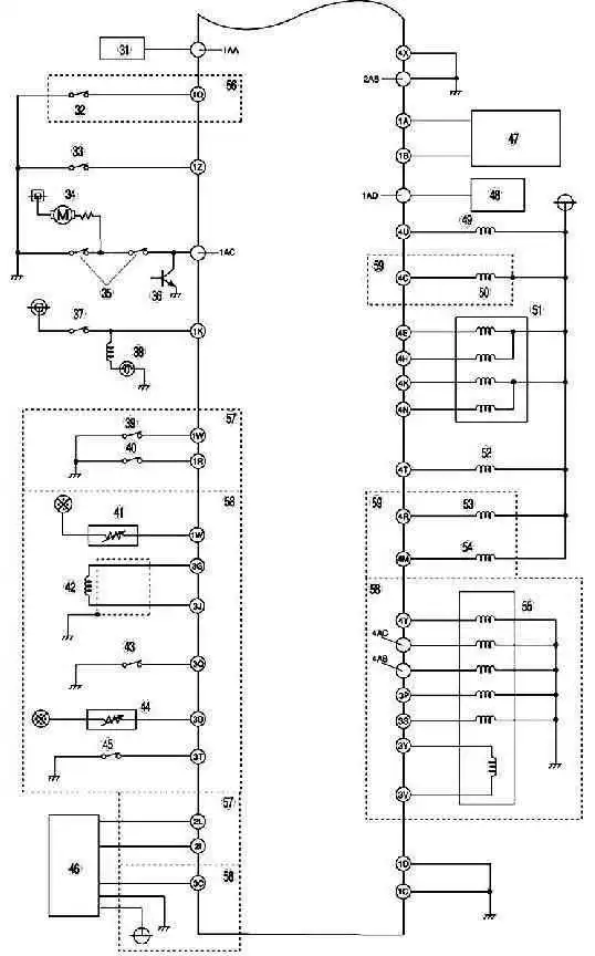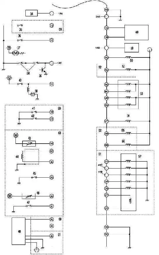 Fig. 3a. Wiring diagram of the fuel system control system of a Mazda 3 car without an immobilizer (part 1) The fuel system control system of a Mazda 3 car without an immobilizer (Fig. 3a, 3b) contains the following elements: 1 - heated oxygen concentration sensor (front); 2 - oxygen concentration sensor with heating (rear); 3 - throttle position sensor; 4 - absolute pressure sensor in the intake manifold; 5 – pressure sensor; 6 - coolant temperature sensor; 7 - mass air flow / intake air temperature sensor; 8 - intake air temperature sensor; 9 - absolute pressure sensor in the intake manifold; 10 – local area network of the controller (CAN); 11 - knock sensor; 12 - crankshaft position sensor; 13 - camshaft position sensor; 14 - fuel injector No. 1; 15 - fuel injector No. 2; 16 - fuel injector No. 3; 17 - fuel injector No. 4; 18 - idle speed regulator; 19 - oxygen concentration sensor heater (front); 20 – oxygen concentration sensor heater (rear); 21 - the relay of the air conditioning system; 22 – cooling fan relay; 23 - cooling fan relay; 24 - cooling fan relay; 25 - cooling fan relay; 26 - fuel pump relay; 27 - ignition switch; 28 - main relay; 29 - engines L8, LF (hot area) and L3; 30 - models with automatic transmission; 31 - generator; 32 - refrigerant pressure sensor (medium); 33 - power steering pressure sensor; 34 - fan motor; 35 - refrigerant pressure sensor (high and low); 36 - switch of the air conditioning system; 37 – the switch of signals of braking; 38 - braking signal; 39 - neutral switch; 40 - clutch switch; 41 - gearbox range switch; 42 – inlet/turbine speed sensor; 43 - HOLD switch; 44 - TFT sensor; 45 - oil pressure sensor; 46 - vehicle speed sensor; 47 - oil pressure sensor; 48 - vehicle speed sensor; 48 - generator; 49 - purge solenoid valve; 50 - control solenoid valve of the VAD system; 51 - valve of the exhaust gas recirculation system; 52 - control solenoid valve Variable tumble; 53 - control solenoid valve of the VIS system; 54 - control oil valve; 55 - valve body; 56 - engines L8, LF (hot area) and L3; 57 - models with a manual transmission; 58 - models with automatic transmission; 59 - L3 engine.