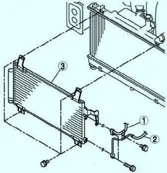Retract the hook of the radiator and pull out the condenser, being careful not to spill any remaining oil from the condenser.