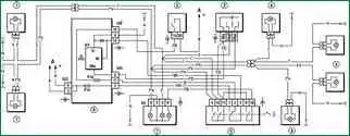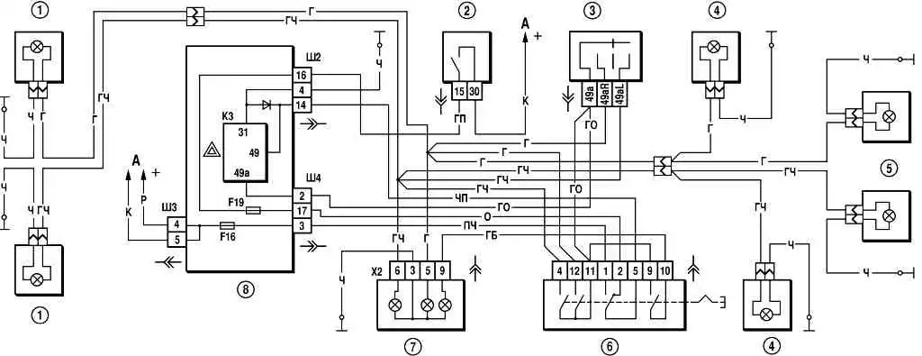 Scheme for switching on direction indicators and alarms: 1 - direction indicator lamps in headlights: 2 - ignition switch; 3 - turn signal switch; 4 - side direction indicators; 5 - turn signal lamps in the rear lights; 6 - alarm switch; 7 - instrument cluster with control lamps for direction indicators and alarms; 8 - mounting block; K3 - relay-breaker for direction indicators and alarm; A - to power supplies