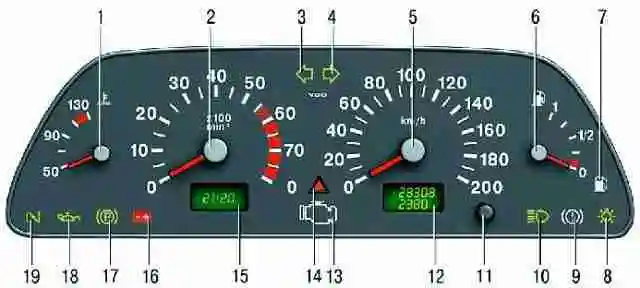 It includes: an electronic speedometer and tachometer, a liquid crystal indicator of the total and daily mileage counter (odometer), a liquid crystal indicator of hours and ambient temperature, a coolant temperature gauge, a fuel gauge, twelve control lamps and six backlight lamps.