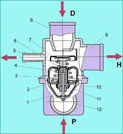 Thermostat: 1 - piston; 2. - main valve; 3 - solid thermosensitive filler; 4 - main valve spring; 5 - outlet pipe to the throttle pipe; 6 - bypass valve spring; 7 - bypass valve; 8 - inlet pipe from the engine; 9 - outlet pipe to the pump; 10 - rubber insert; 11- piston holder; 12 - inlet pipe from the radiator; D - fluid inlet from the engine; P - fluid inlet from the radiator; H - fluid outlet to the pump.