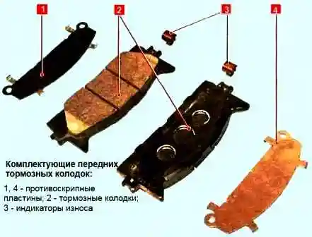 The brake pads of the front wheels must be replaced when the linings are worn (the minimum allowable thickness of the friction linings is 1.0 mm), the linings are not firmly connected to the base, the working surfaces are oiled and deep grooves or chips