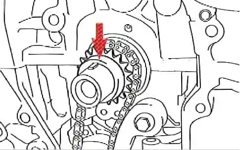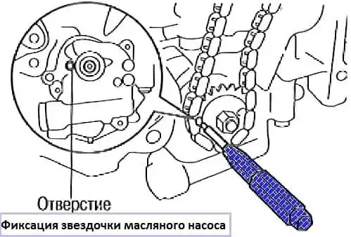 We turn the engine crankshaft counterclockwise by 90º approximately until the holes in the sprocket and the oil pump housing are aligned, after which we fix the sprocket from turning with a suitable rod with a diameter of 4 mm and unscrew its fastening nut