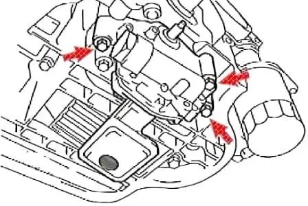 We unscrew the three bolts (shown by arrows) securing the oil pump to the cylinder block