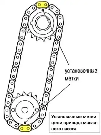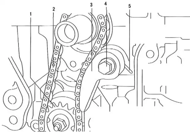 We unscrew the bolt 4 (Fig. 3) and remove the tensioner 3 of the oil pump drive chain with spring 5, the oil pump drive chain 2 and the oil pump sprocket 1