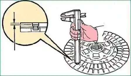 Check the thickness of the clutch disc lining using a vernier caliper.