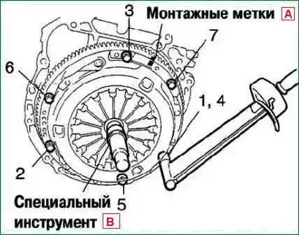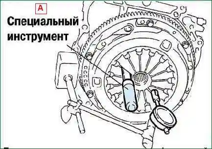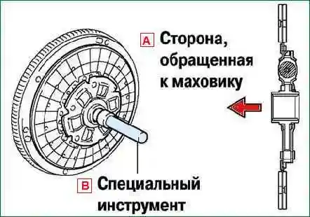 We insert the special tool into the clutch disc, then install the disc on the flywheel