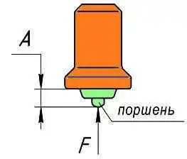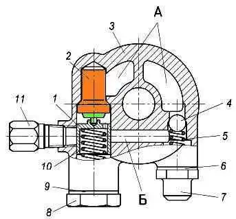 Cuando la temperatura del aceite alcanza 81 + 2°C, el pistón del elemento de fuerza térmica 2, lavado por el flujo de aceite caliente, comienza a mover el émbolo 10, abriendo paso para el flujo de aceite del canal B al enfriador de aceite.