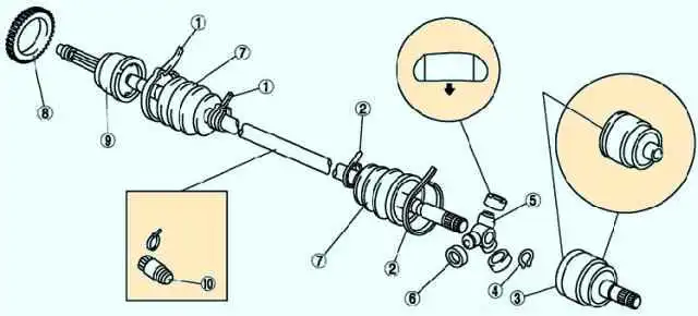 Los componentes del eje de transmisión delantero se muestran en la fig. 1.