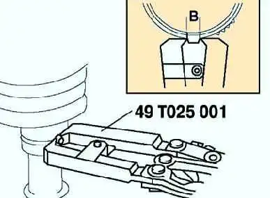 Si el espacio "B" es demasiado pequeño, reemplace la abrazadera de la funda, aumente el espacio libre de la herramienta especial y comprima la nueva funda.