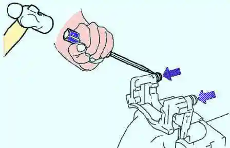 Sujetando la pinza en un tornillo de banco de mordaza blanda, use un destornillador y un martillo para quitar las fundas del pasador guía (fig. 4).