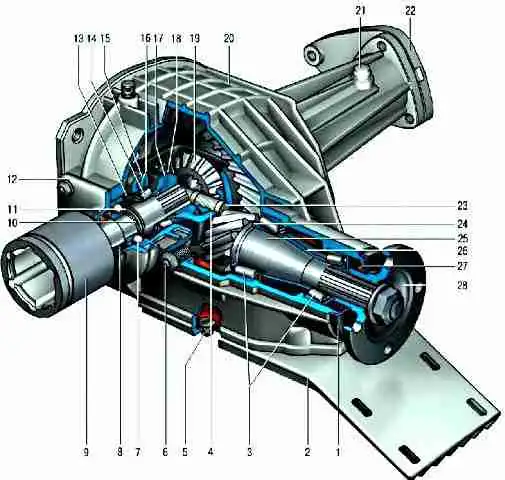 Reductor del eje delantero del coche: 1 - deflector de lodo; 2 - tapa inferior de la caja de cambios; 3 - cojinetes del engranaje impulsor; 4 - caja del diferencial; 5 - tapón de drenaje; 6 - tapón de los orificios de llenado y control; 7 - cojinete del cuerpo de la bisagra interna; 9 - caja de relleno; 9 - alojamiento de la bisagra interior de la tracción de la rueda; 10 - arandela de resorte; 11 - anillo de retención; 12 - tapa del cojinete; 13 - tuerca de ajuste; 14 - cojinete de caja diferencial; 15 - tapa del cojinete; 16 - perno de fijación de la tapa; 17 - arandela de soporte; 19 - satélite; 19 - engranaje de semiejes; 20 - caja de cambios; 21 - respiradero; 22 - tapa de cojinete de la bisagra interior; 23 - eje de los satélites; 24 - anillo de ajuste; 25 - engranaje impulsor; 26 - espaciador de cojinete; 27 - sello de aceite del engranaje impulsor; 28 - brida