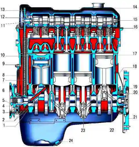 fig. 1. Sección longitudinal del motor: 1 - casquillo del cojinete principal; 2 - inserto de cojinete de biela; 3 - cigüeñal; 4 - polea del cigüeñal; 5 - tuerca de fijación de la polea; 6 - rueda dentada del cigüeñal; 7 - transmisión por cadena de distribución; 9 - tapa del accionamiento del mecanismo de distribución de gas; 9 - junta de tapa; 10 - pistón; 11 - arandela de empuje; 12 - arandela de seguridad; 13 - rueda dentada del árbol de levas; 14 - tapa de culata; 15 - árbol de levas; 16 - junta de tapa de culata; 17 - bloque de cilindros; 19 - tapa de la carcasa del embrague; 19 - soporte del sello de aceite trasero; 20 - medio anillo de empuje externo del cigüeñal; 21 - volante; 22 - medio anillo de empuje interior del cigüeñal; 23 - biela; 24 - tapón de vaciado de aceite