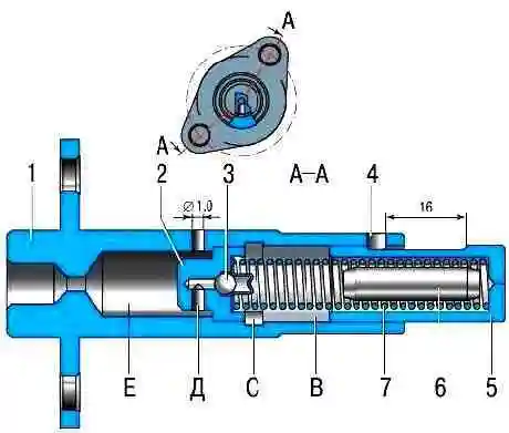 El aceite del sistema de lubricación a través del tubo 4 a presión ingresa a la cavidad (E) del tensor, luego a través del orificio (D) y el conjunto de válvulas 2 ingresa a la cavidad (B), donde actúa sobre el émbolo 5.