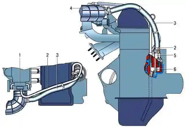 El sistema de ventilación del cárter se cierra, con la eliminación de los gases del cárter a través del separador de aceite 6 hacia el tubo de admisión, luego los gases del cárter se envían a los cilindros del motor, donde se queman .