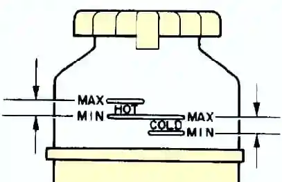 Si el fluido de trabajo está tibio, el nivel de fluido está en el intervalo "CALIENTE" en el tanque o la varilla medidora, si está frío, en el intervalo "FRÍO".