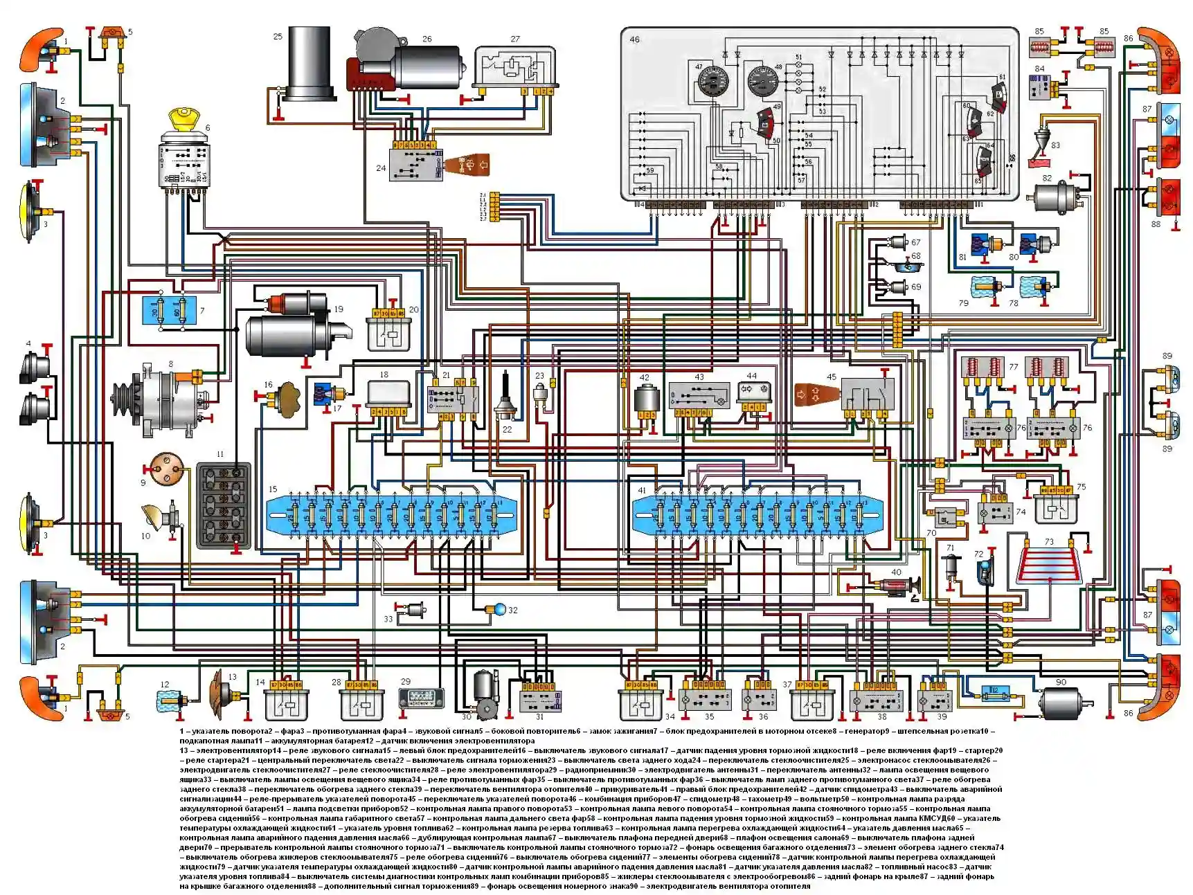 Бортовая электросеть автомобиля (кроме цепи стартера и электровентилятора системы охлаждения) подсоединена к аккумуляторной батарее через плавкий предохранитель на 60А.