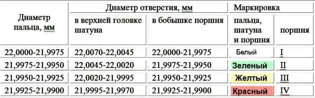 Пальцы, поршни и шатуны разбиты на четыре размерные группы и маркируются краской.