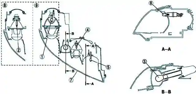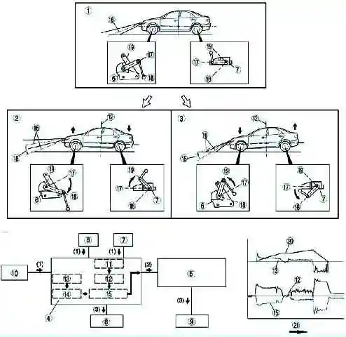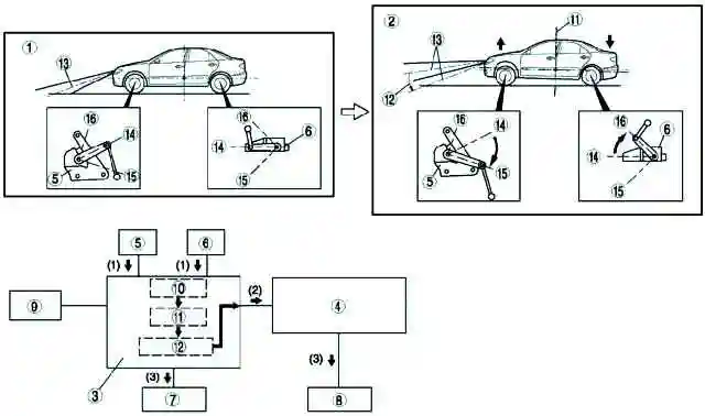 - 1. Фаралар қосылып тұрғанда, авто нивелирлеуді басқару блогы (мастер) ABS/TCS HU/CM немесе DSC HU/CM құрылғысынан көлік жылдамдығы сигналын және алдыңғы және артқы авто нивелирлеуден аспа діріліне негізделген сигналды қабылдайды. датчиктер кіріс ретінде.