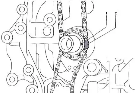 - таңбаланған звеноны 2 (сурет) иінді біліктің 1-дегі туралау белгісімен туралай отырып, тізбекті уақыт тізбегінің жетек жұлдызшасына қоямыз;