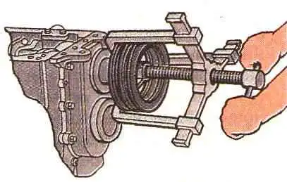 Сұйықтық сорғысын және желдеткіш жетегінің шкивін иінді біліктің шетінен бекітетін болтты бұрап босатыңыз, дизельдің алдыңғы тірегін, содан кейін арнайы тартқышты пайдаланып шкивті алыңыз (Cурет 2).