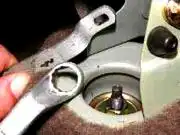 Расположив губки рожкового ключа на 13 на ограничительном кольце хода шестерни привода и, ударив молотком по ключу, спрессовываем ограничительное кольцо