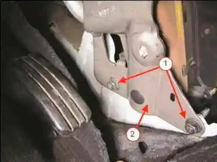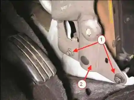 Головкой на 13 откручиваем два болта 1, рисунок 1, нижнего крепления усилителя 2 поперечины панели приборов к основанию кузова.