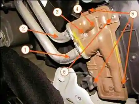 Головкой Torx T20 откручиваем два винта 5, отжимаем три фиксатора, извлекаем радиатор 6 из корпуса отопителя и сливаем остатки охлаждающей жидкости.