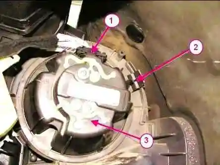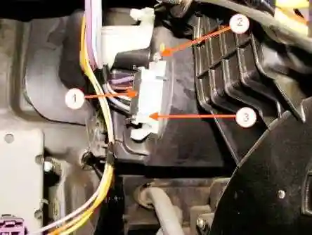 Отсоединить колодку 1, рисунок 13, жгута проводов, головкой Torx T20 отвернуть винт 2 крепления резистора 3, извлечь резистор из блока отопителя.