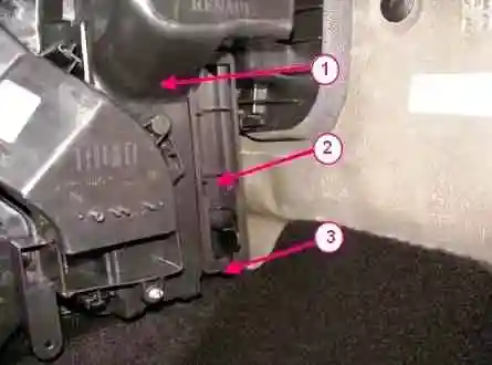 Отжать фиксатор 3, рисунок 18, извлечь фильтр 2 салона 2, расположенный в корпусе отопителя 1 со стороны