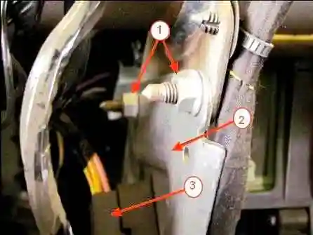 Головкой на 13 откручиваем две гайки 1, рисунок 11, верхнего крепления усилителя 2 поперечины через окно в панели приборов, отсоединяем колодку 3 жгута проводов и снимаем усилитель 2.