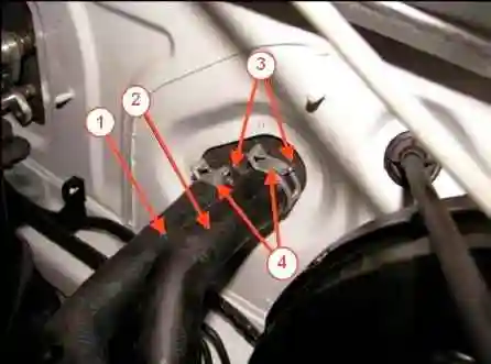 Головкой Torx T20 откручиваем винт 3, рисунок 12, и отсоединяем патрубки подводящий 2 и отводящий 1 от радиатора 4 отопителя.
