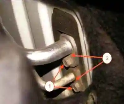 Для автомобилей, оборудованных кондиционером: из моторного отсека головкой на 10 отворачиваем два болта 1, рисунок 6, крепления трубопроводов к испарителю, разъединяем соединения и устанавливаем на трубопроводы и блок испарителя технологические заглушки.